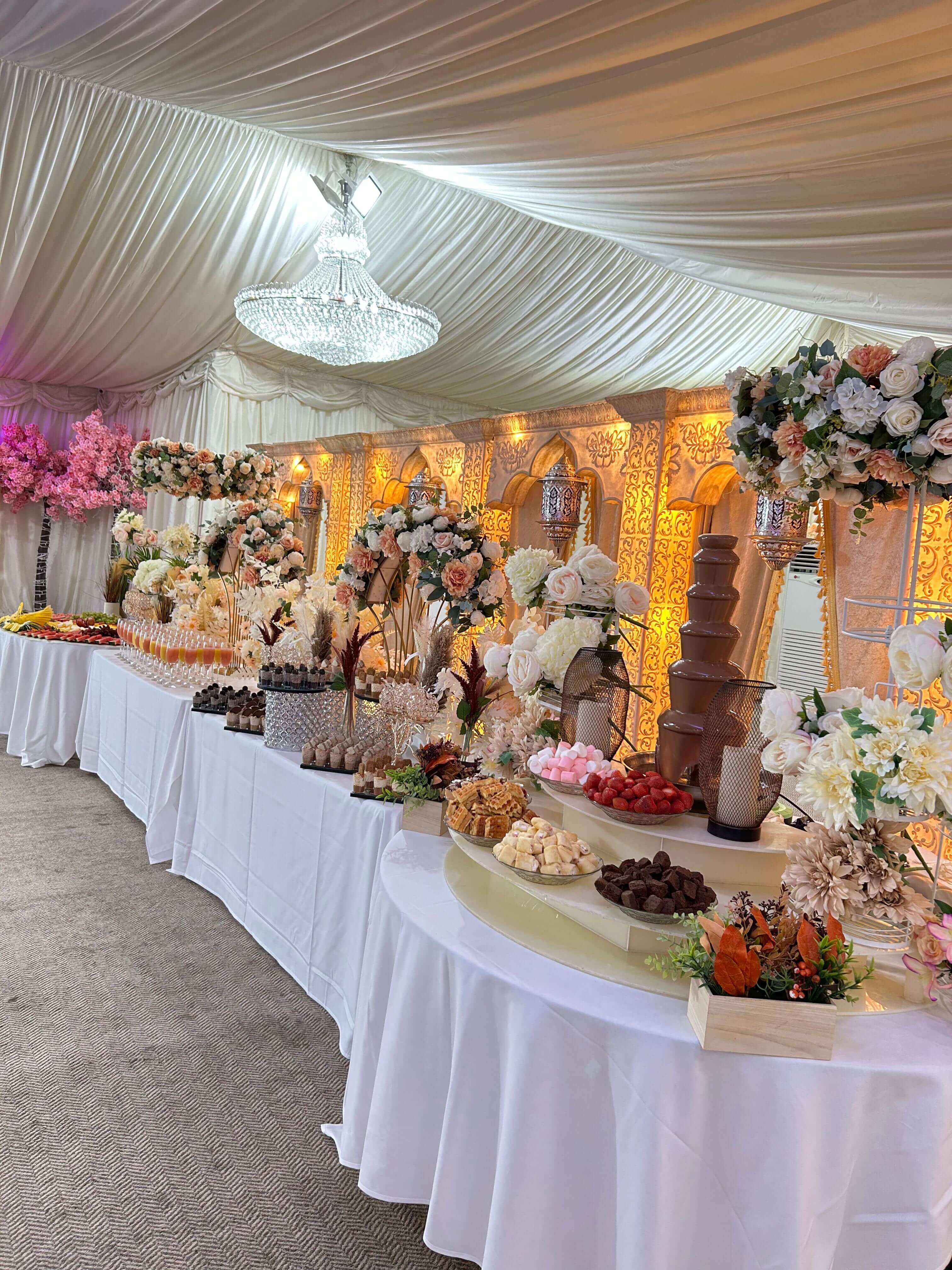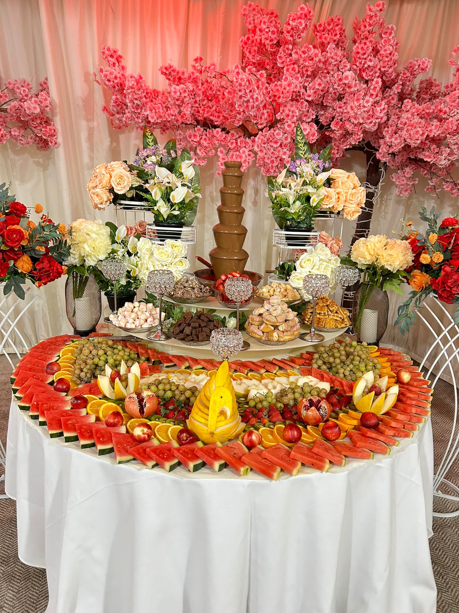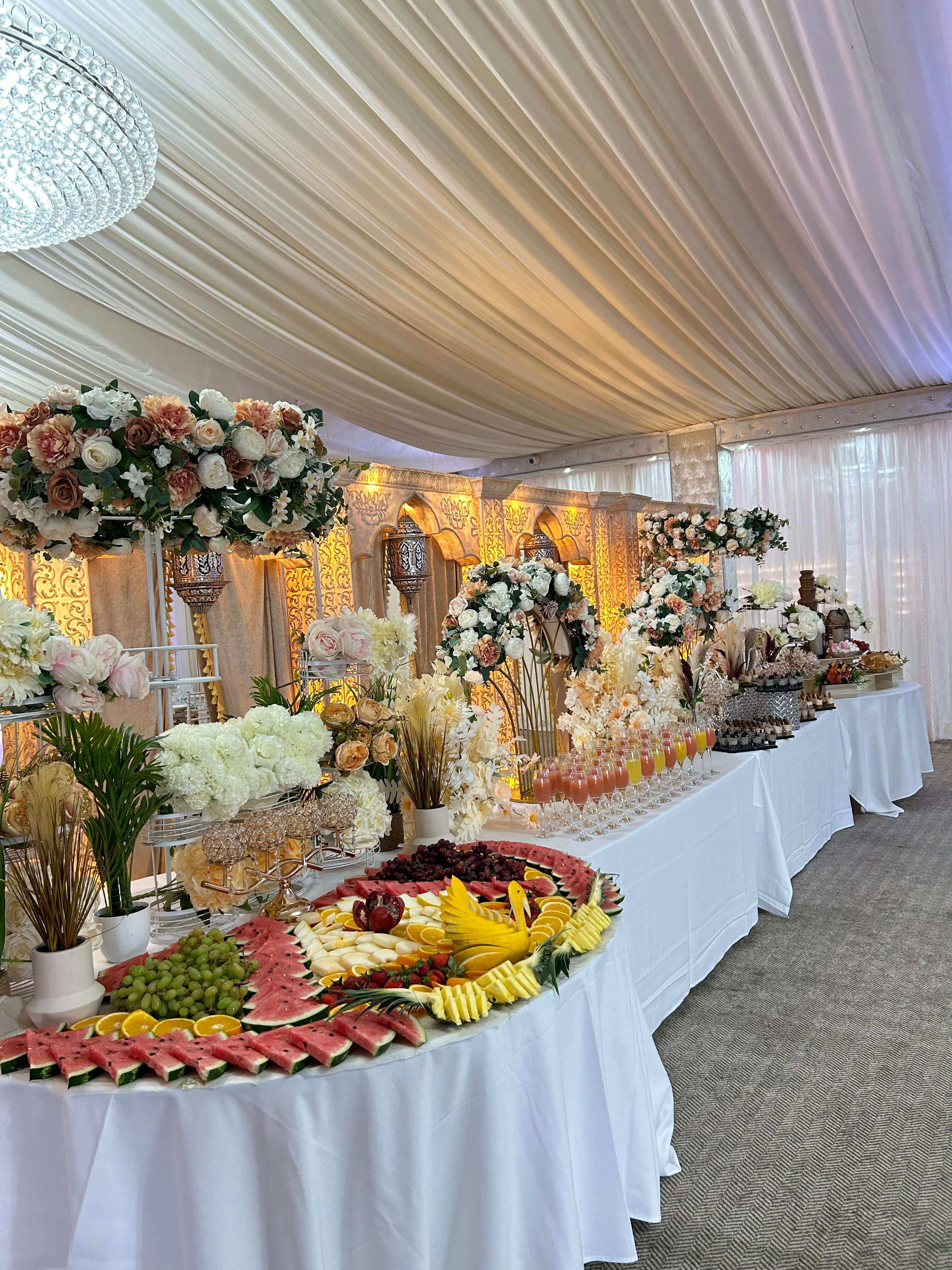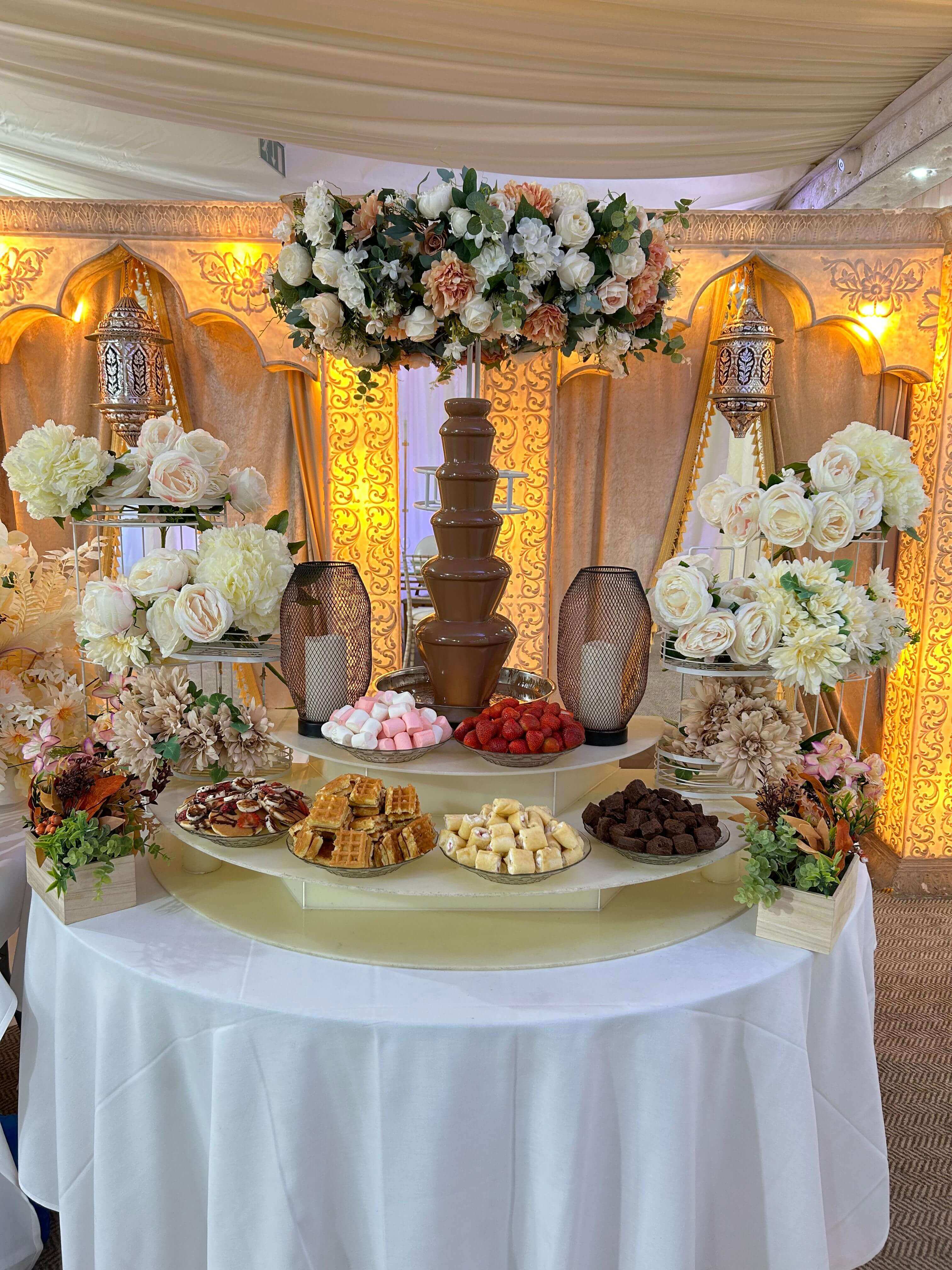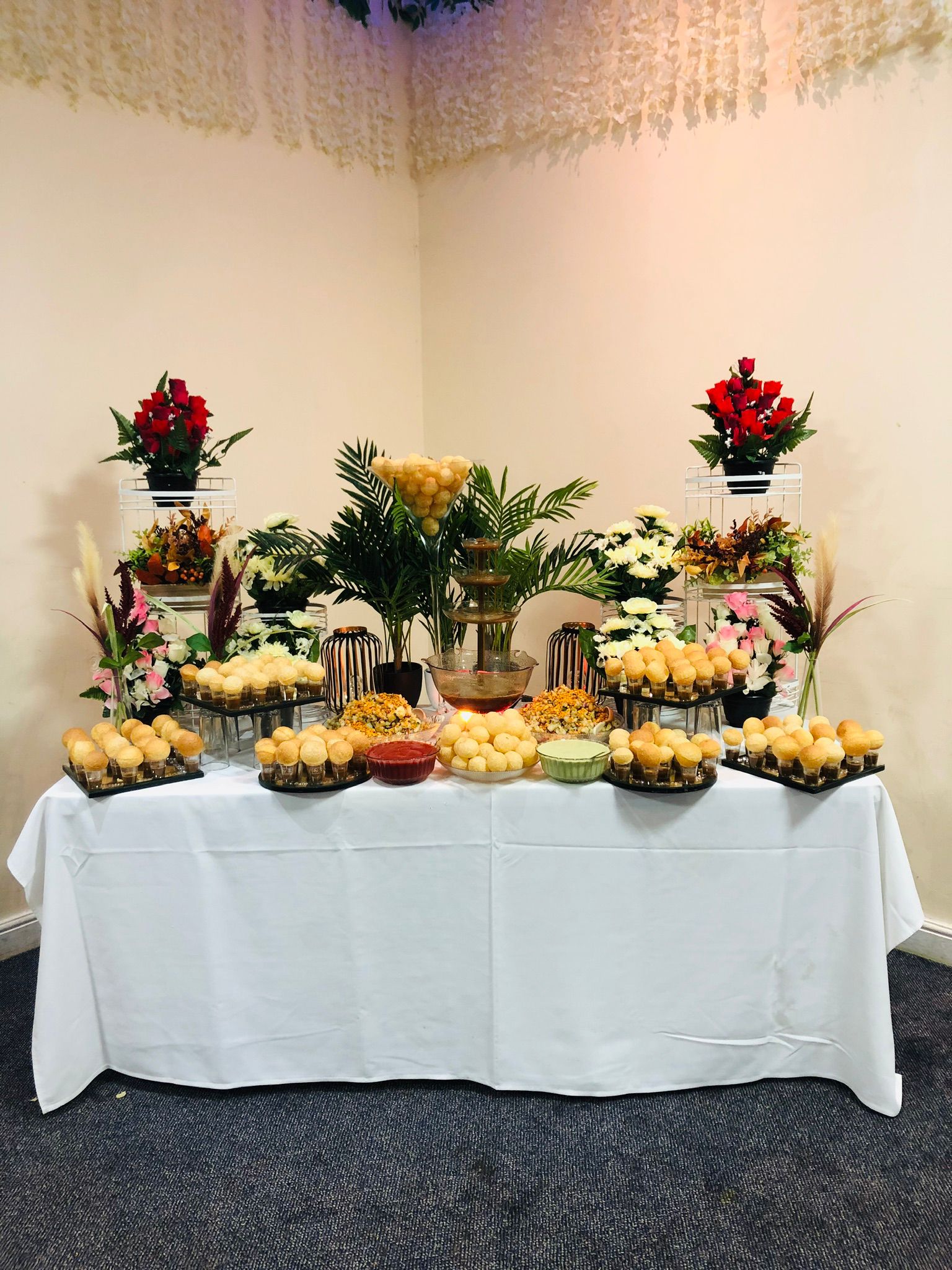 We bring a full spectrum of offerings to each event, starting with our beautifully crafted fruit tables and indulgent chocolate fountains. Whether combined for a touch of elegance or featured separately, these elements are sure to impress. Our dessert and candy tables are filled with sweet treats, while our savory selections, including Gol Gappay, Papri Chat, and Samosa Chat, add a flavorful twist. Elegant fruit platters, refreshing mocktail drinks, and bespoke cakes complete our suite of services, catering to every aspect of your celebration and ensuring a memorable experience for every guest.